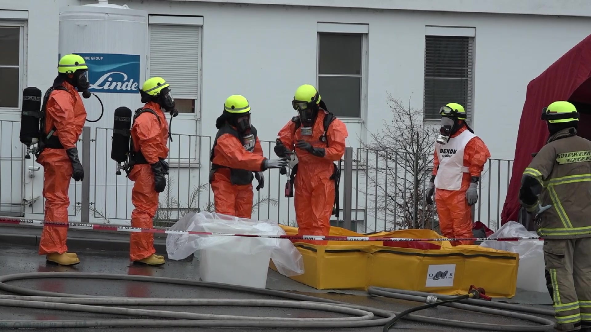 Der Gefahrstoffzug der Berufsfeuerwehr Regensburg sowie die freiwilligen Feuerwehren aus Burgweinting und Oberisling wurde zur Unterstützung an die Einsatzstelle alarmiert. Mit Chemikalien-Schutzanzügen konnten die Feuerwehrkräfte unter schweren Atemschutz die evakuierte Notaufnahme betreten. Mit einem speiziellen Lüfter wurden Schläuche nach draußen gelegt, um die möglicherweise kontaminierte Luft aus dem Geäude abzusaugen. Ebenfalls wurde eine Dekontaminationsstelle von den Einsatzkräften der Feuerwehr vor dem Gebäude errichtet. Das auslaufende Mittel konnte von der Feuerwehr anschließend behutsam geborgen werden.