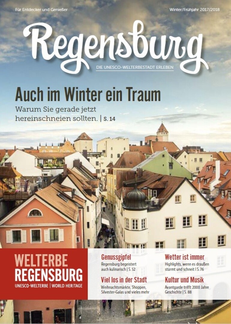 „Regensburg – Die UNESCO-Welterbestadt erleben“ ist der Titel eines neuen touristischen Magazins für Interessierte aus dem deutschsprachigen Raum (DACH). Es widmet sich mit großformatigen Bildern, Beiträgen zu Jahresthemen und Service-Tipps der Destination Regensburg. Herausgegeben wird das Magazin von der Regensburg Tourismus GmbH. Wenn das Heft bei der Zielgruppe gut ankommt, soll es künftig zwei Mal im Jahr erscheinen und umfangreich und qualitativ über Regensburg und die Region berichten. Das redaktionell gestaltete Reisemagazin ist erstmalig am 15. November 2017 mit einer Auflage von 5.000 Exemplaren in der Herbst-/Winterausgabe erschienen.